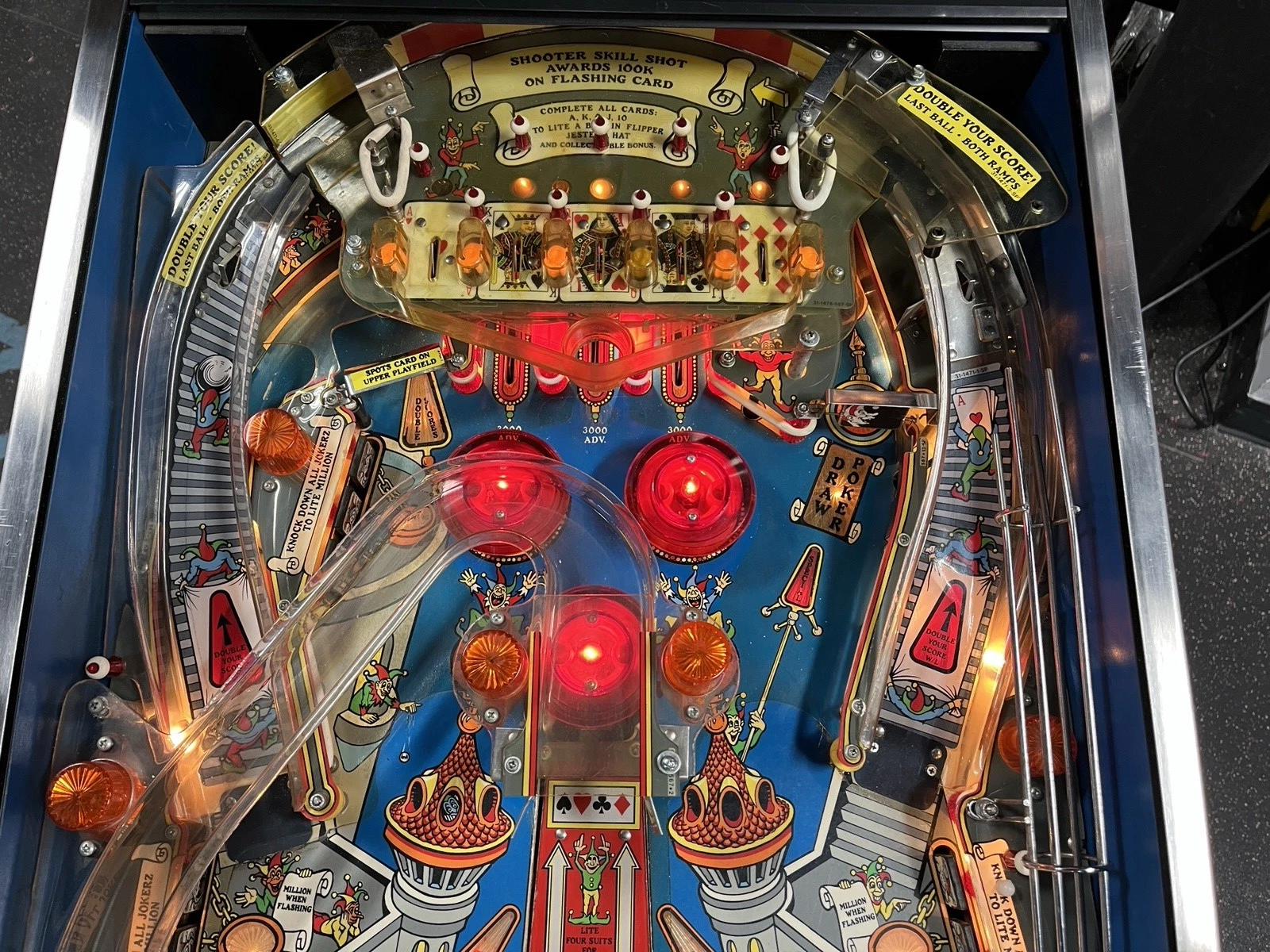The Jokerz Pinball Machine features a multi-level playfield filled with ramps, bumpers, and targets. Players navigate through the colorful world of jokers and cards while aiming for high scores. Key playfield features include: