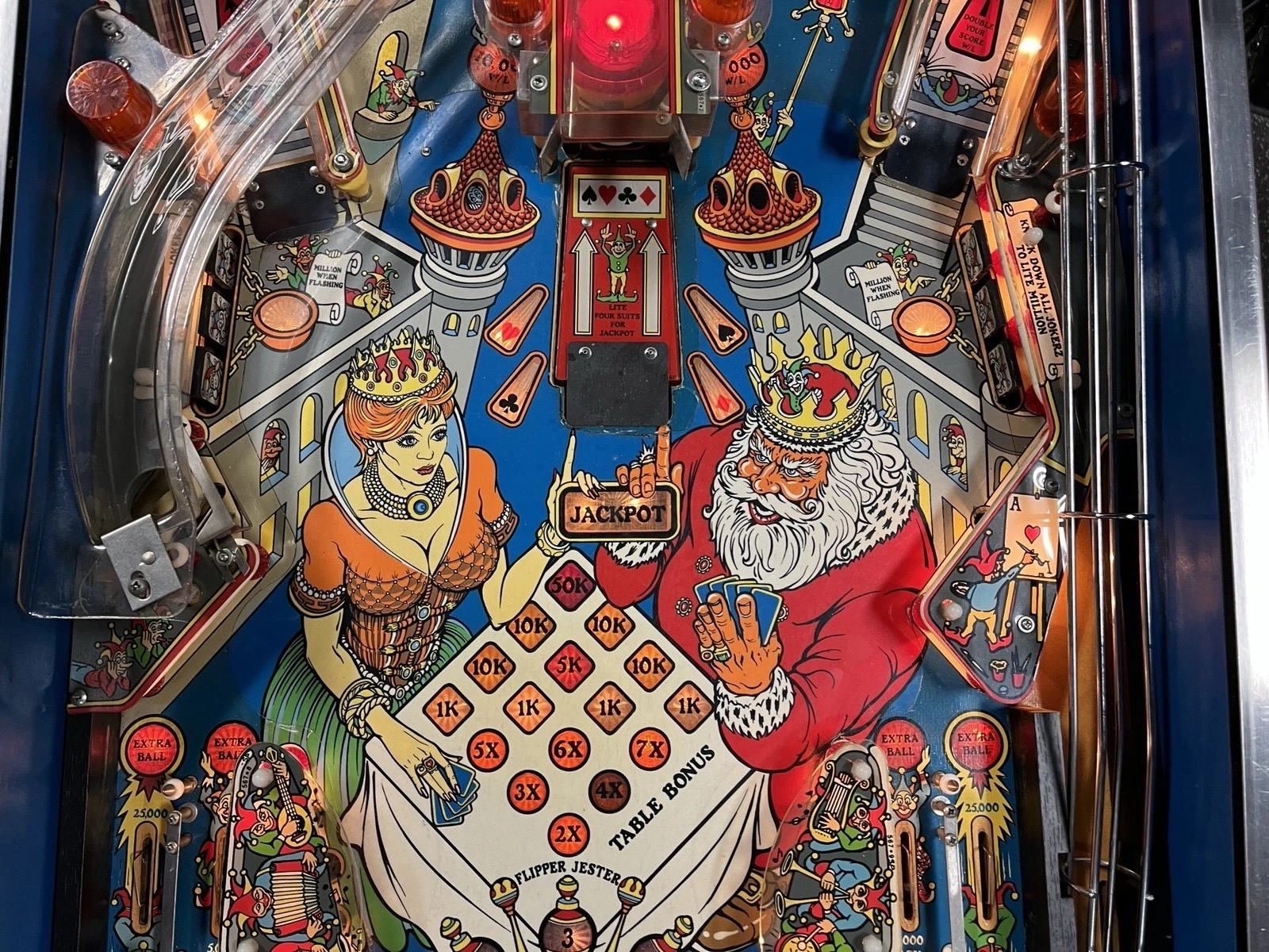 - Backglass Artwork: The backglass showcases a dramatic depiction of jokers, card motifs, and colorful designs that capture the playful chaos of the game.