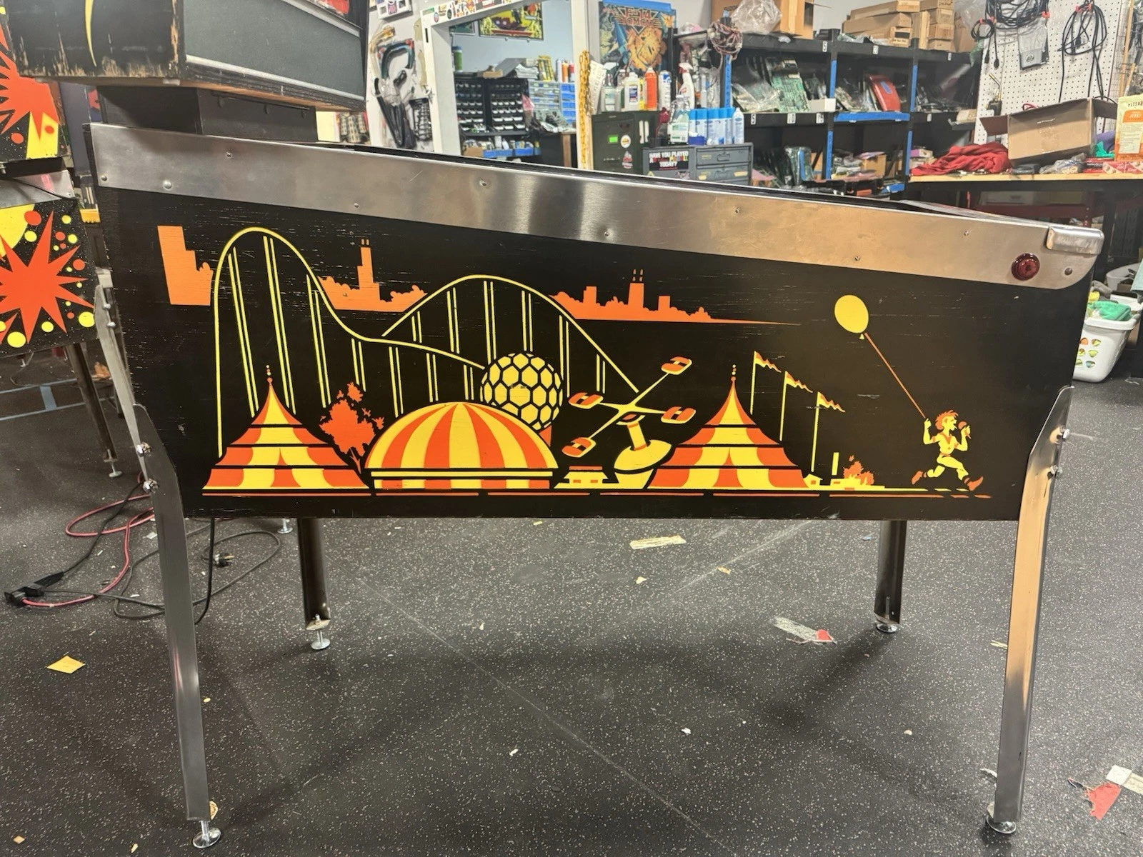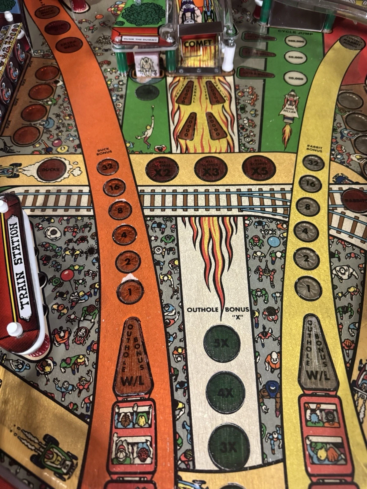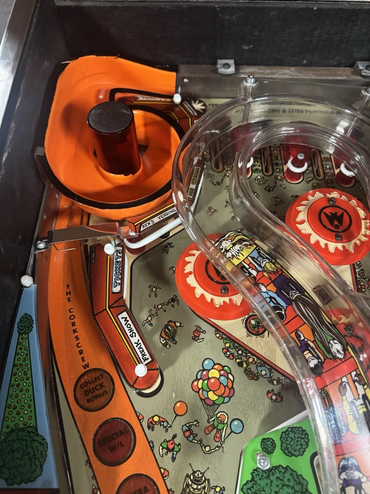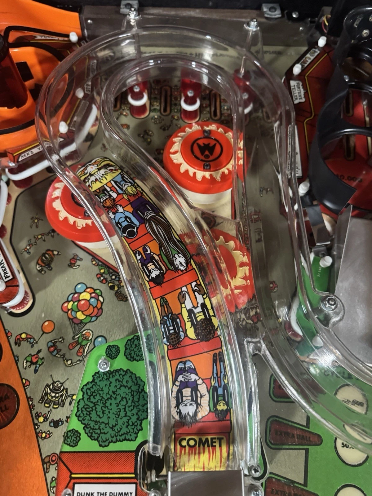 Playfield Artwork – Bold illustrations of rollercoaster tracks, carriages, and amusement park motifs guide the ball through interactive elements.