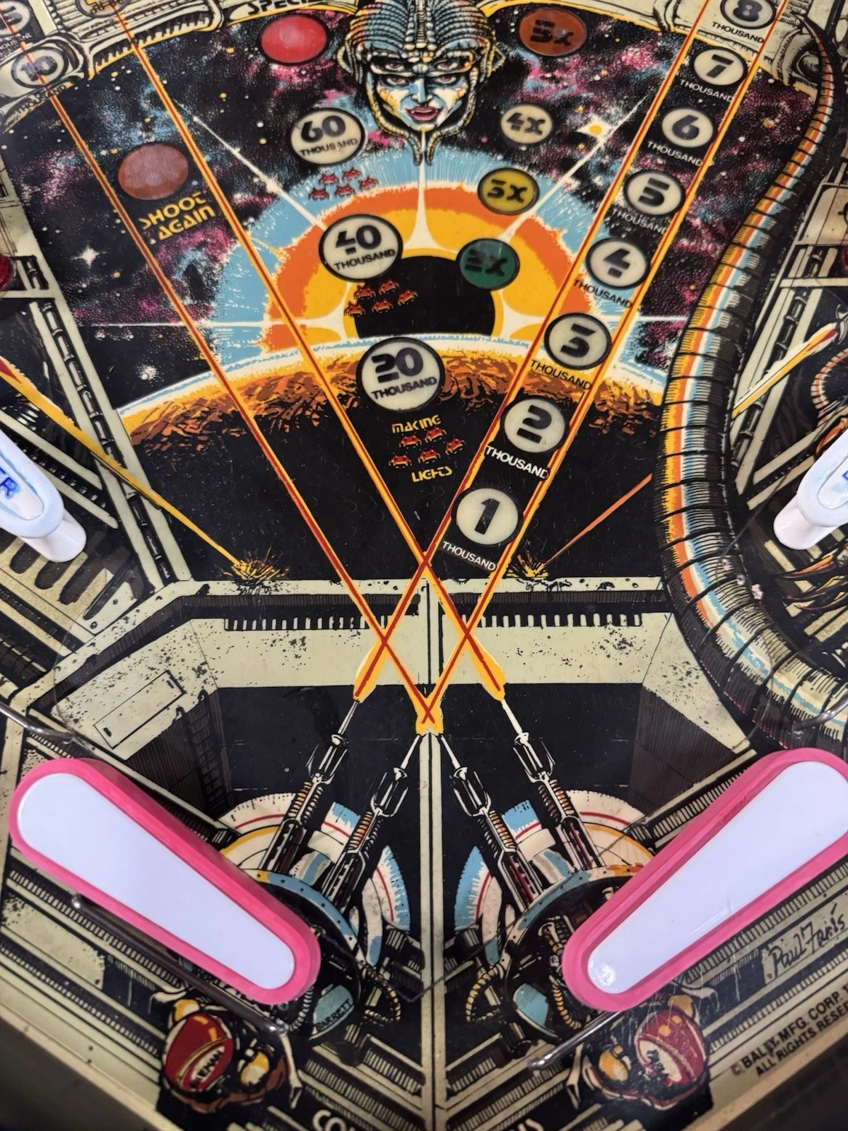 Released in 1980 by Bally, this machine capitalizes on the popularity of the Space Invaders video game phenomenon. The pinball adaptation integrates a space-themed playfield with ramps, targets, and bumpers inspired by the iconic alien invasion motif.